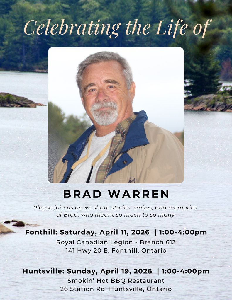 Because Brad had family and friends near and far, there will be two Celebrations of Life. You’re welcome to join us in Fonthill on April 11, 2026, or in Huntsville on April 19, 2026. Details below: